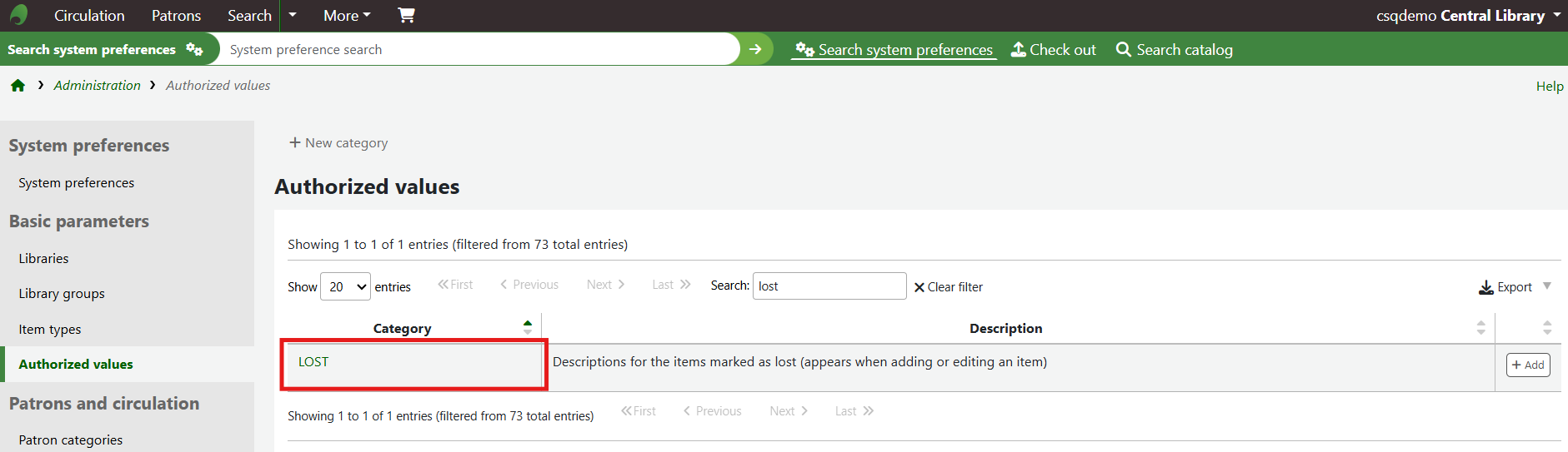 Search for LOST in the search bar at the top of the table. This will narrow the table down to the LOST authorised value. Click the LOST button to under the Category column.