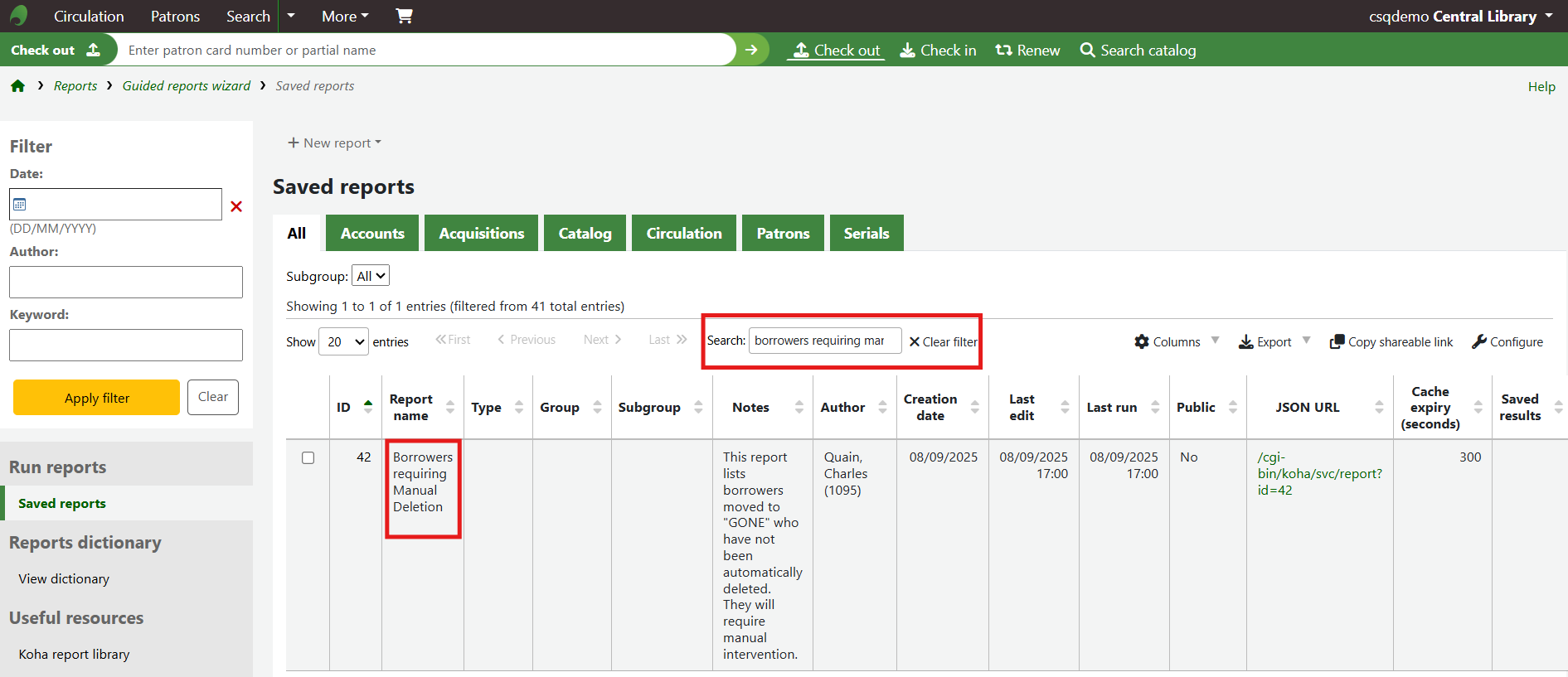 At the top of this table there will be a grey search bar where you can search for a number or keyword of the report. Search for Borrowers requiring Manual Deletion and this will narrow down the table to that specific report.