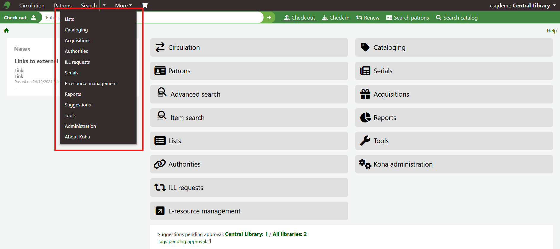 Click About Koha at the bottom of the dropdown menu.