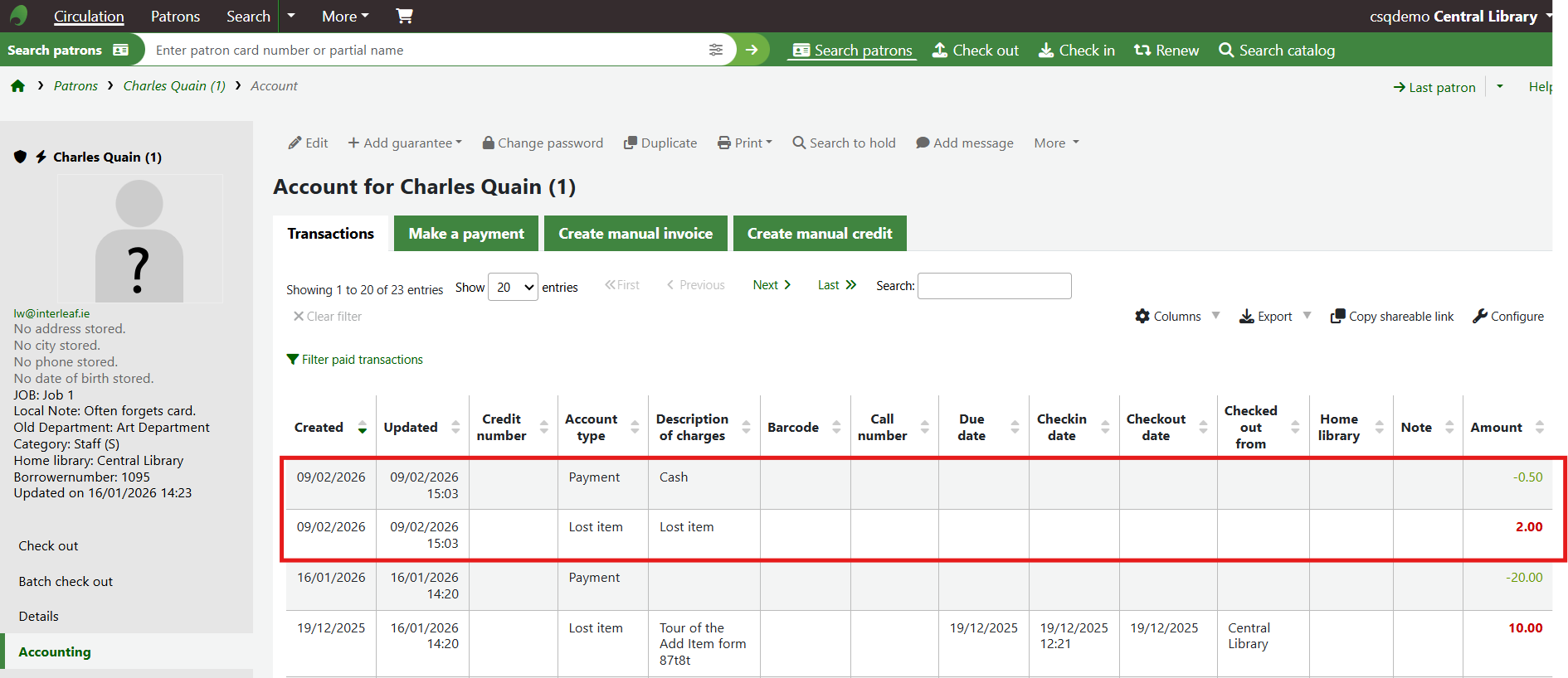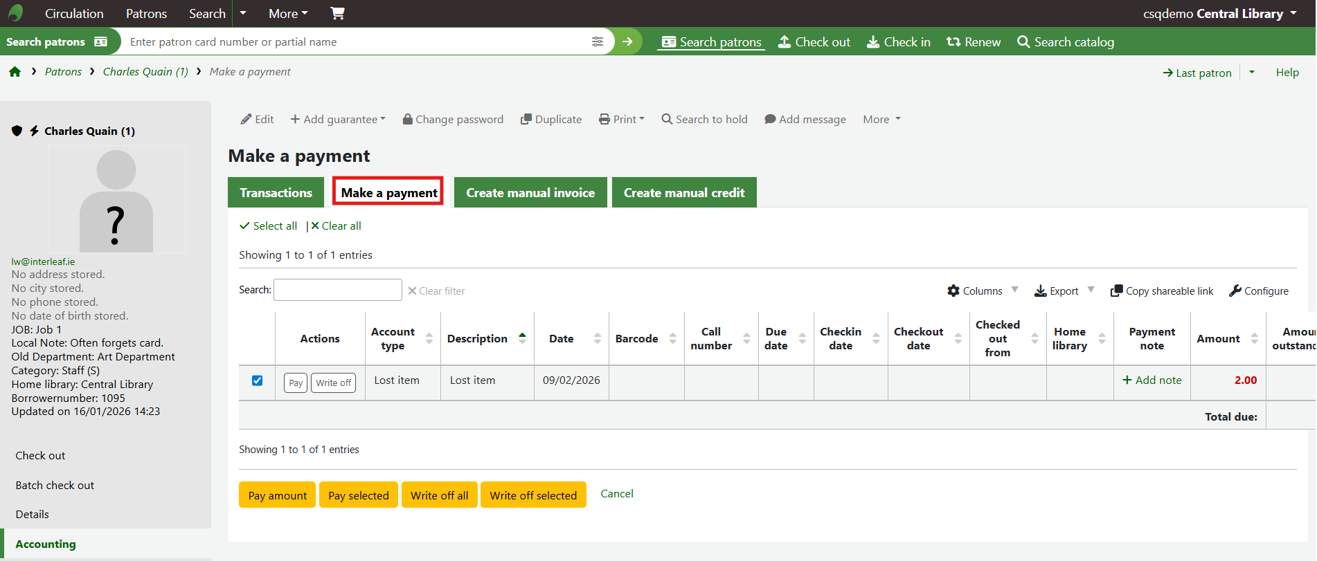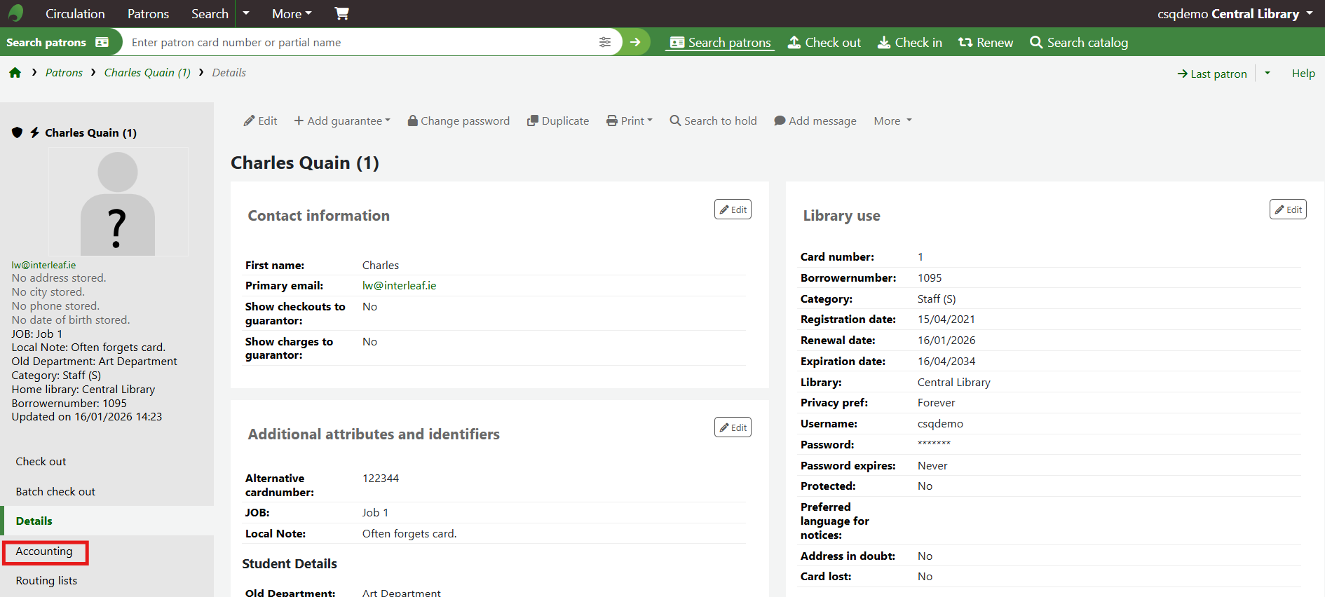 To check the fines on a patron account, go into the Accounting tab on the left hand side.