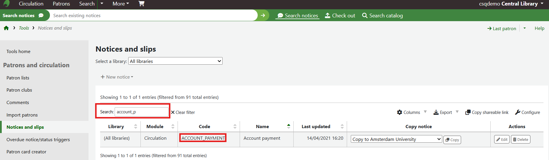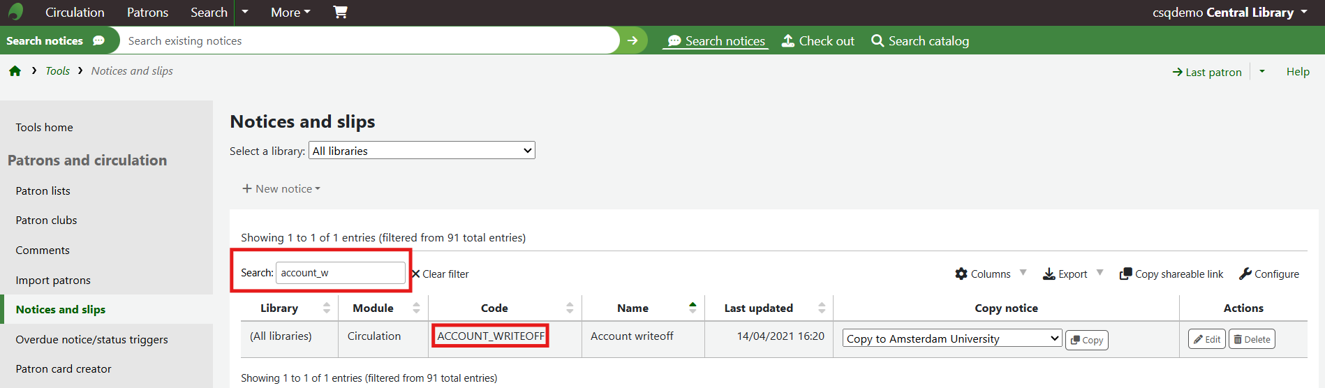 The two notices related to this functionality are ACCOUNT_PAYMENT and ACCOUNT_WRITEOFF. Confirm that these two notices appear within this table by using the search box at the top of the table.