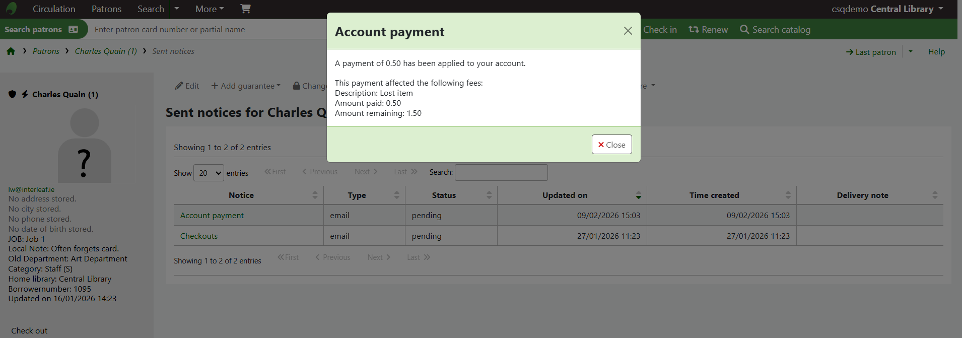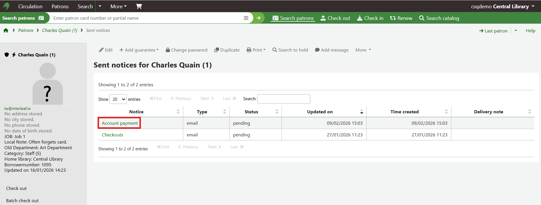 Under the Notices tab on the patron account an Account payment notice will appear, pending being sent.