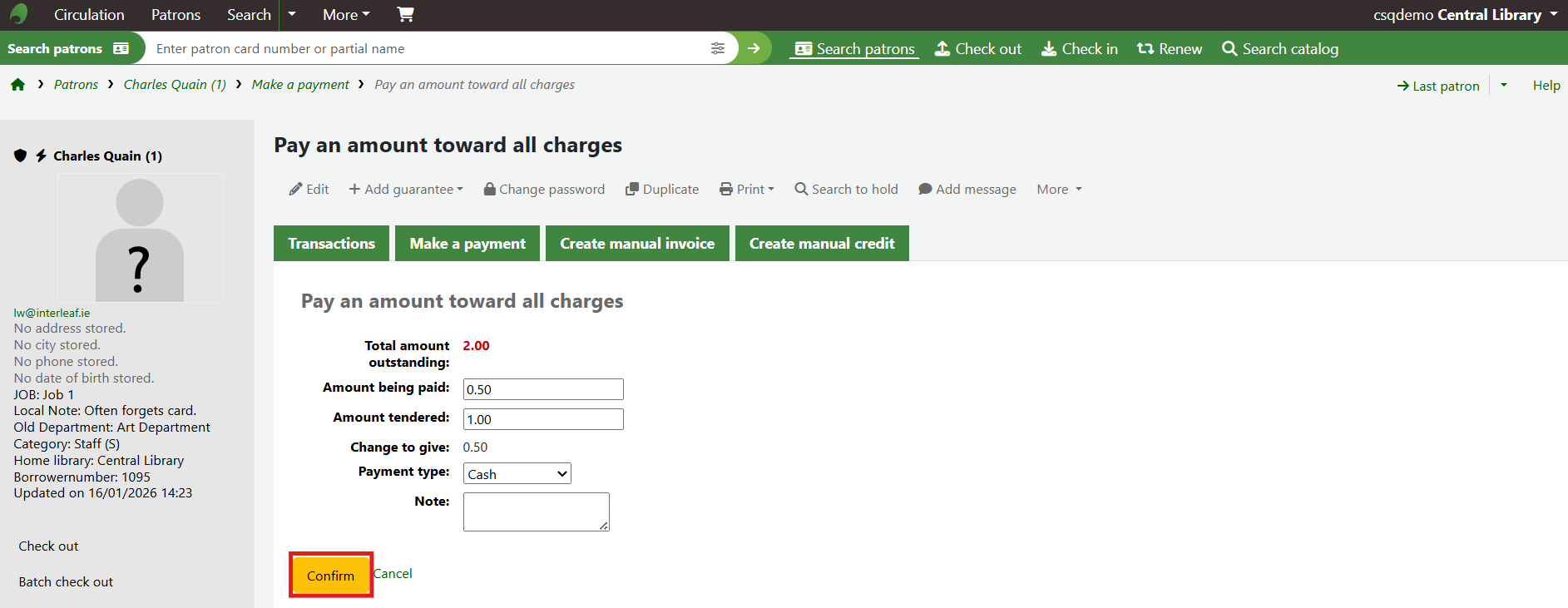 In this example, only part of the fine is being paid, however this functionality will work if any or all of the fine is paid or written off. Input the amount being paid and click Confirm.