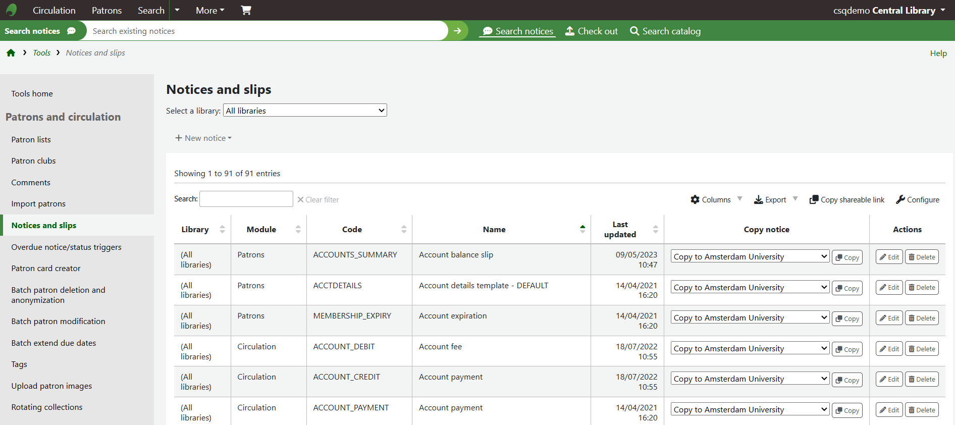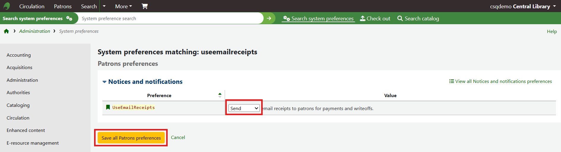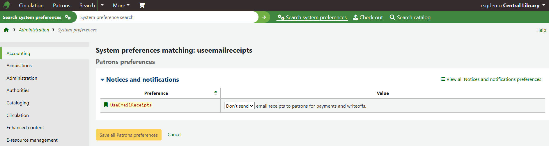 Ensure this is set to Send email receipts to patrons for payments and writeoffs and hit Save all Patrons preferences.