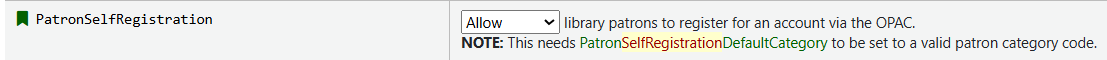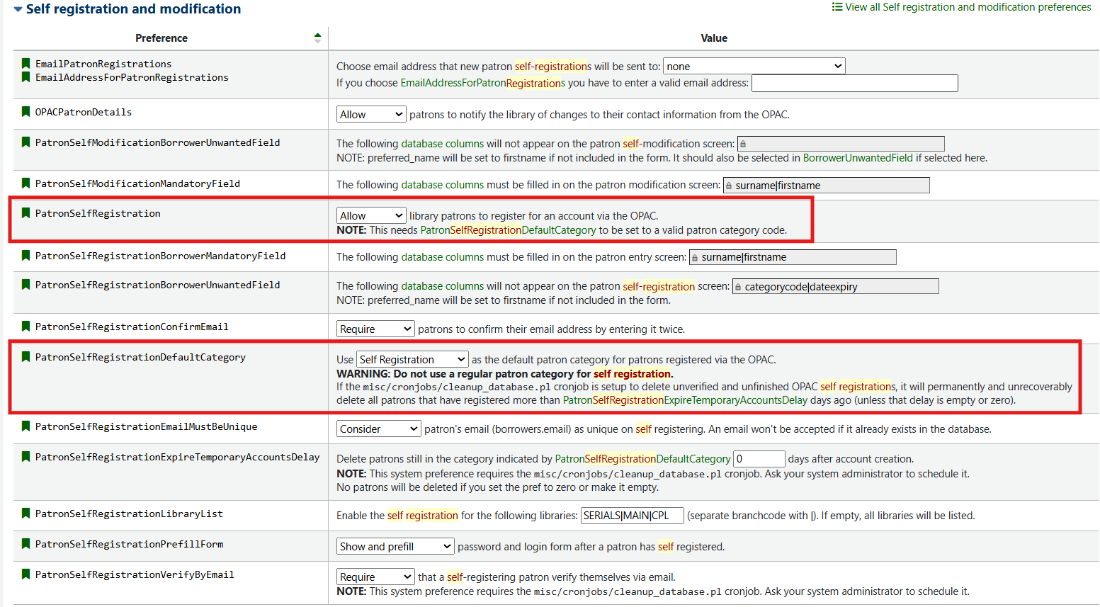 This will bring up a variety of system preferences which relate to the self registration process. The two system preferences to enable self registration are PatronSelfRegistration and PatronSelfRegistrationDefaultCategory.