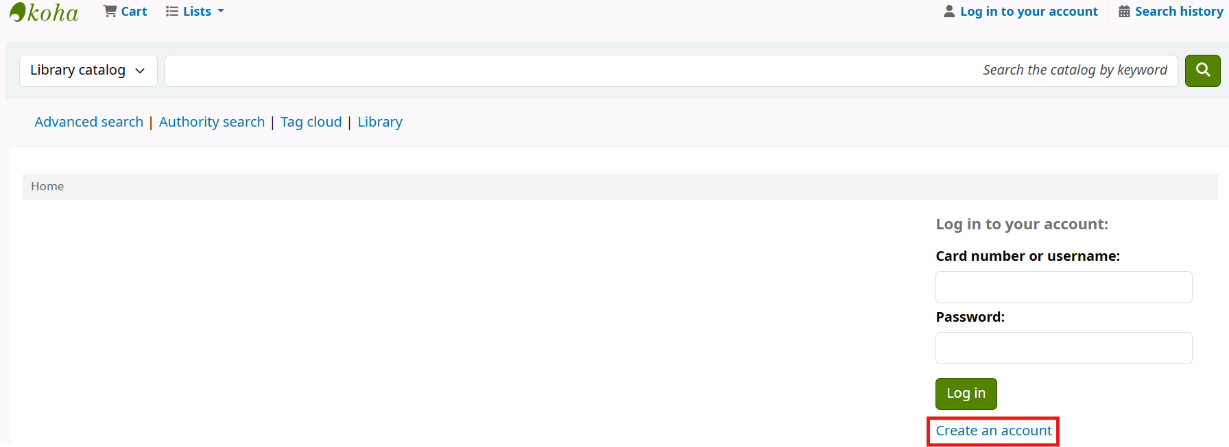 Once the system preference PatronSelfRegistration has been set to allow and the PatronSelfRegistrationDefaultCategory has been filled in a line will appear under the login box on the OPAC, Create an Account.