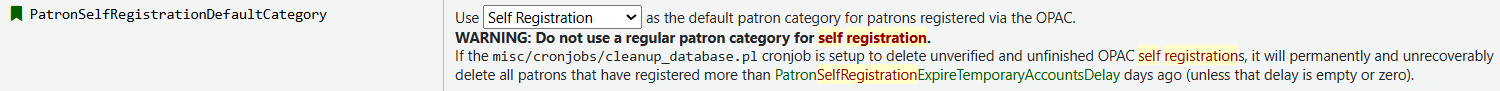 It is good practice to create a custom patron category to be used for self registered patrons rather than a standard patron category. This is because many sites will at some point use the clean up database script which, amongst other things, will remove any unverified self registered patrons from the site. If this happens any information about the self registered patrons will be removed, even if they have been using the site for an extended period of time. Select the preferred patron category from the dropdown menu in the PatronSelfRegistrationDefaultCategory system preference and click Save all OPAC preferences. If a preferred category doesn't exist, a new one will need to be created.
