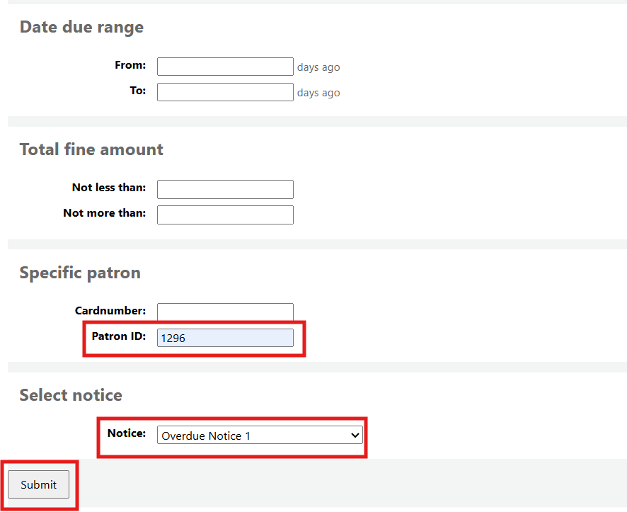 You can run the report for an individual patron by defining the cardnumber or borrowernumber, selecting the preferred notice and clicking Submit.