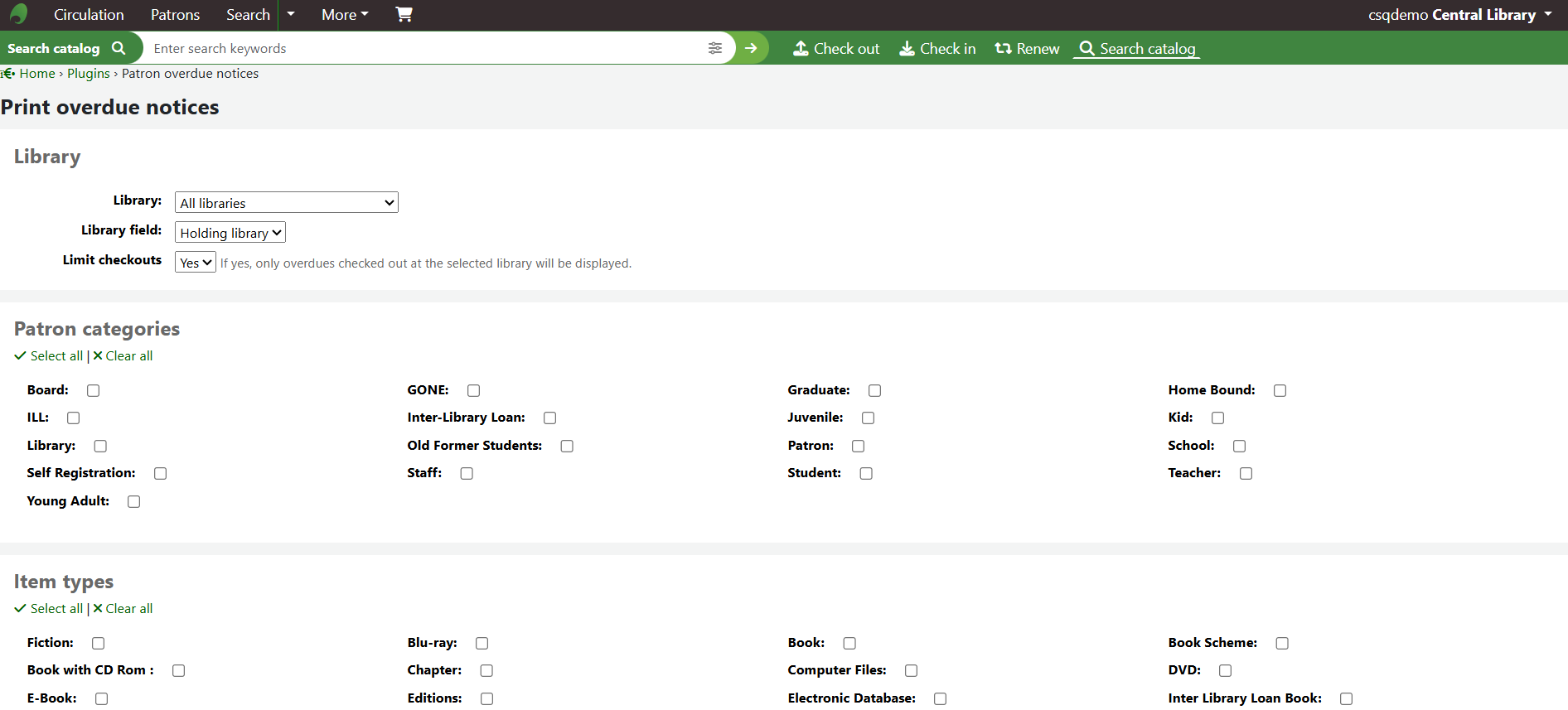 The drawback of using this function is that everything must be done manually as opposed to using the Notices Triggers section of Koha, where overdues go out automatically once everything has been configured correctly. Also, the notice created cannot be edited once it has been produced. Changes can only be made in the Notices & slips area of Koha, and then the plugin will need to be run again to create a new version of the notice.