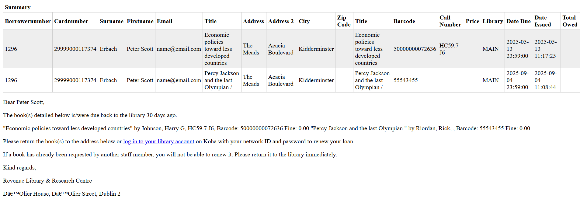 This will open a new page with details of the overdue items checked out to the patron and details of the overdue notice below: