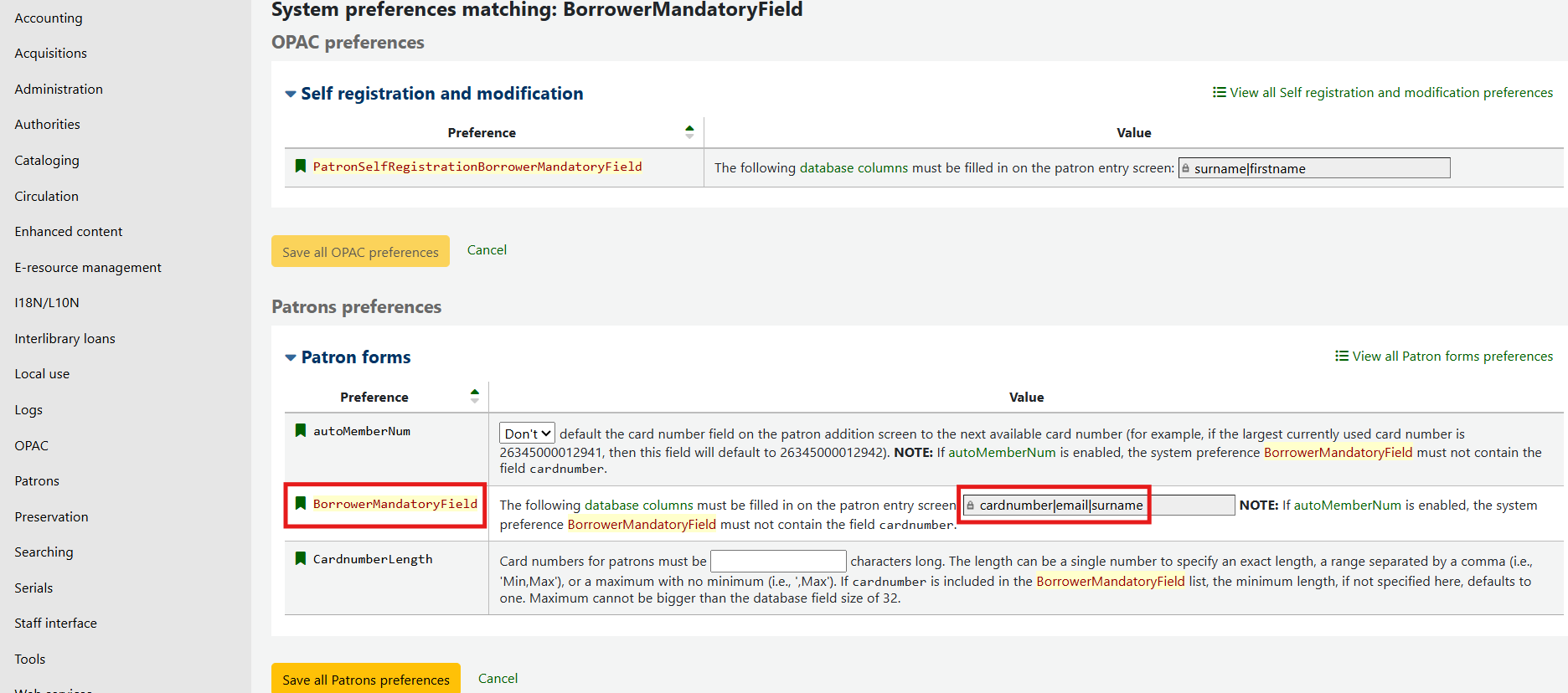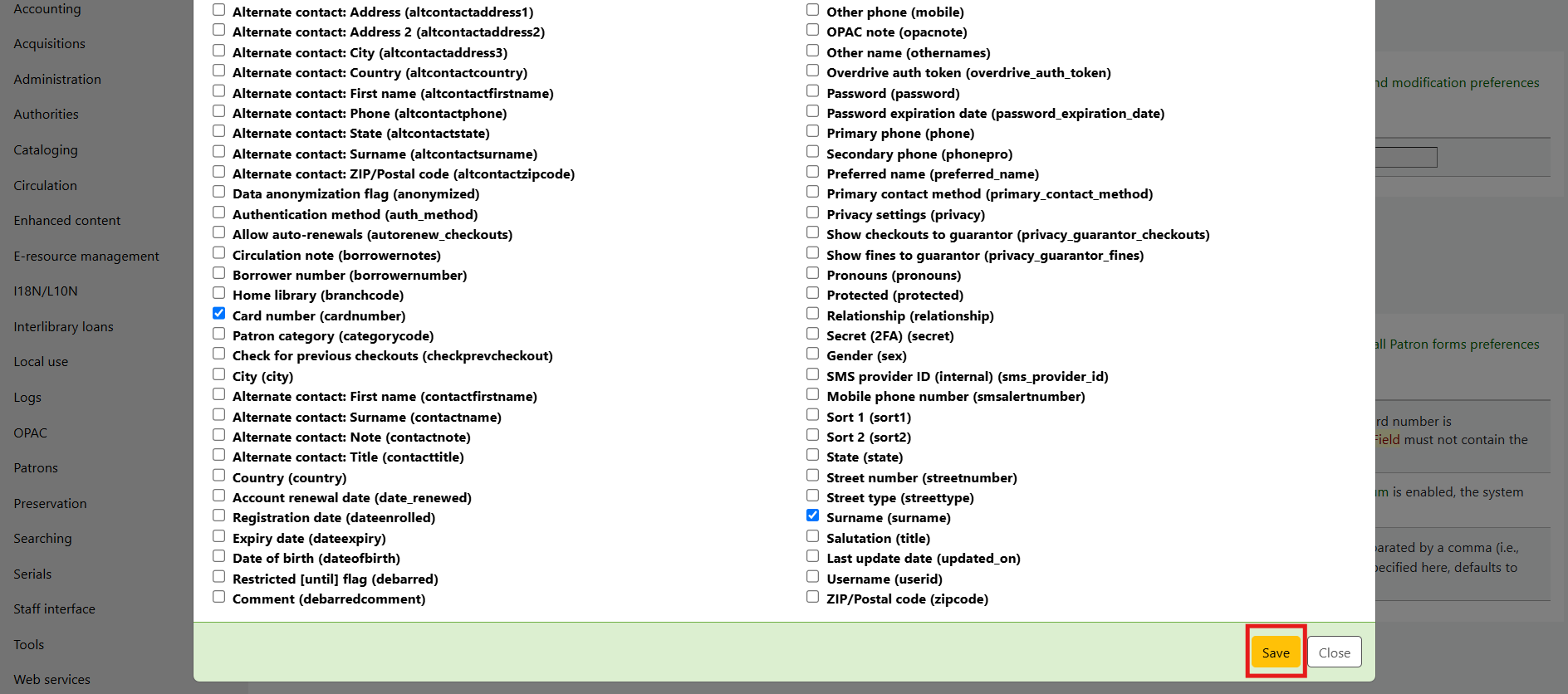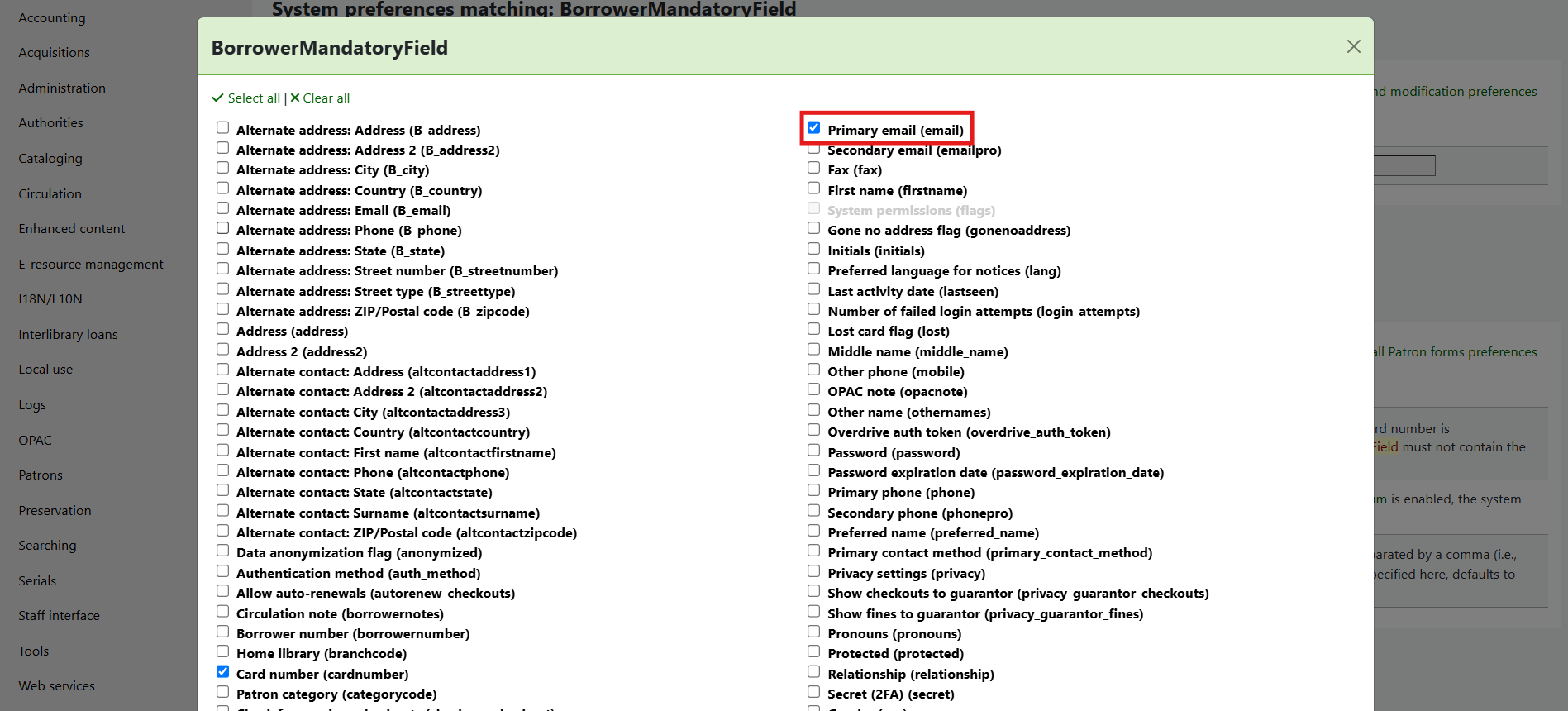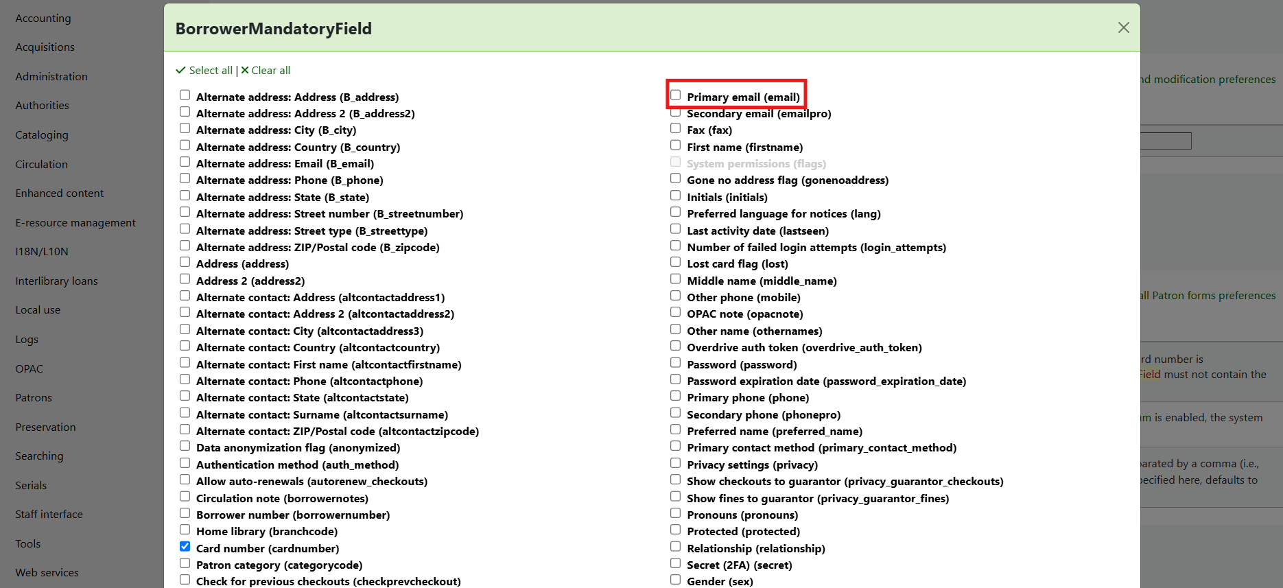 For example, if the primary email field should be mandatory when creating a new patron, click the box to the left hand side of that field name in this system preference,