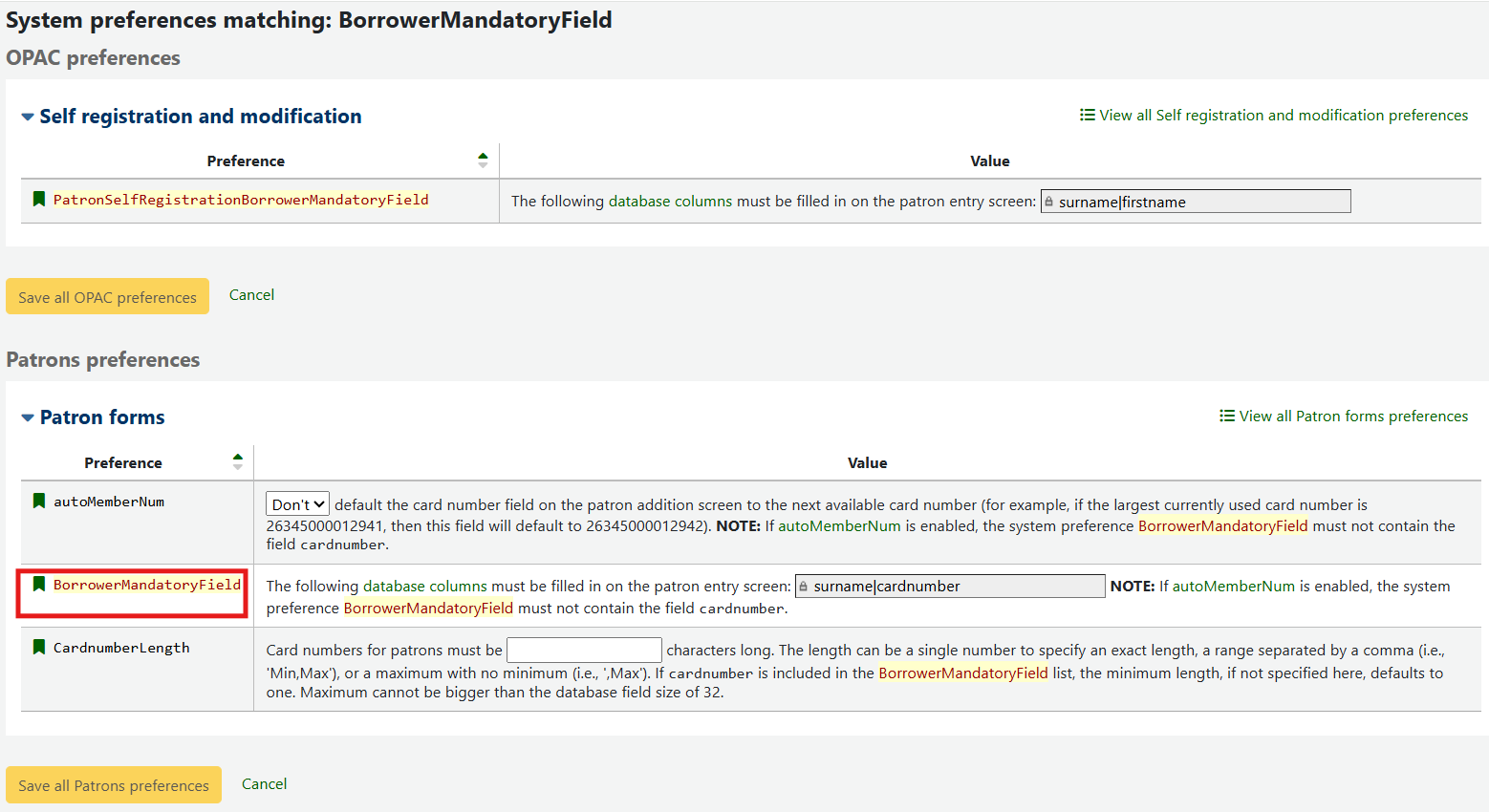 This will bring up several system preferences with the same phrase in it. The system preference to enable this functionality is called BorrowerMandatoryField.