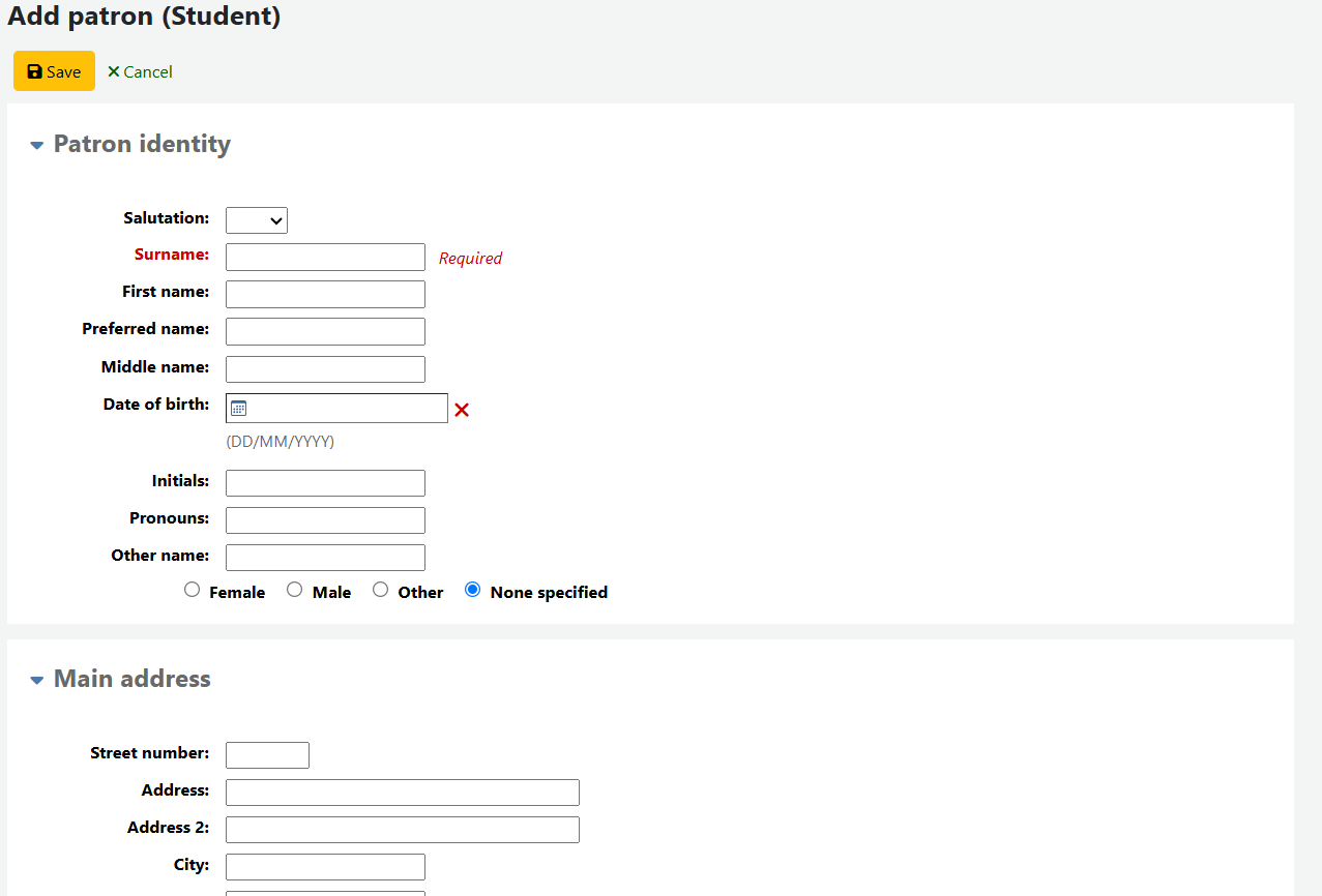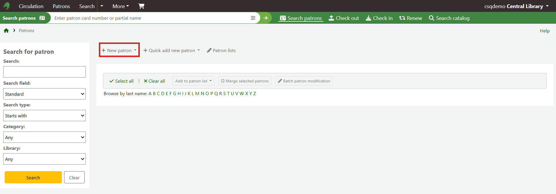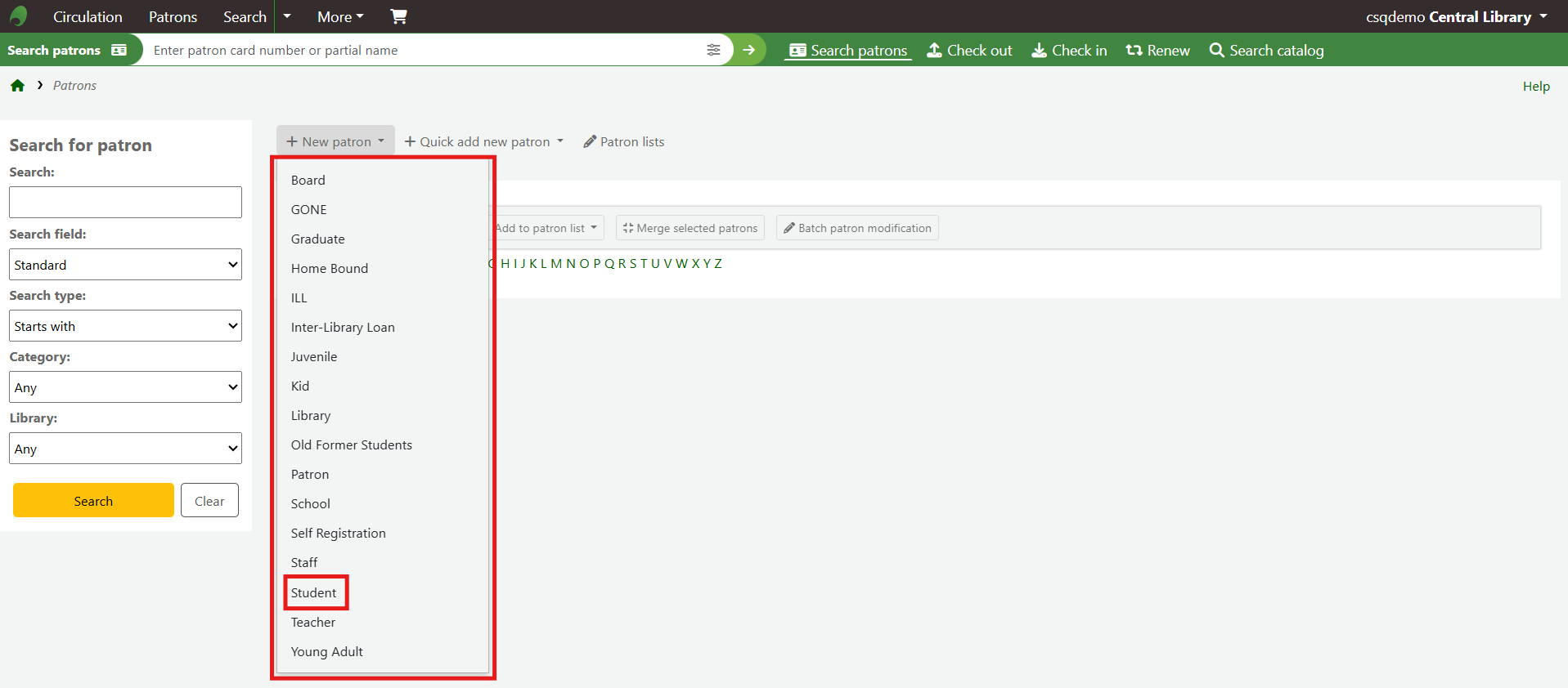 Navigate to the patron add form through Patrons > New patron dropdown and choose any patron category from the dropdown. Specific patron categories can vary from site to site, so the options on the dropdown menu on your own site might look different from the one shown in this example.