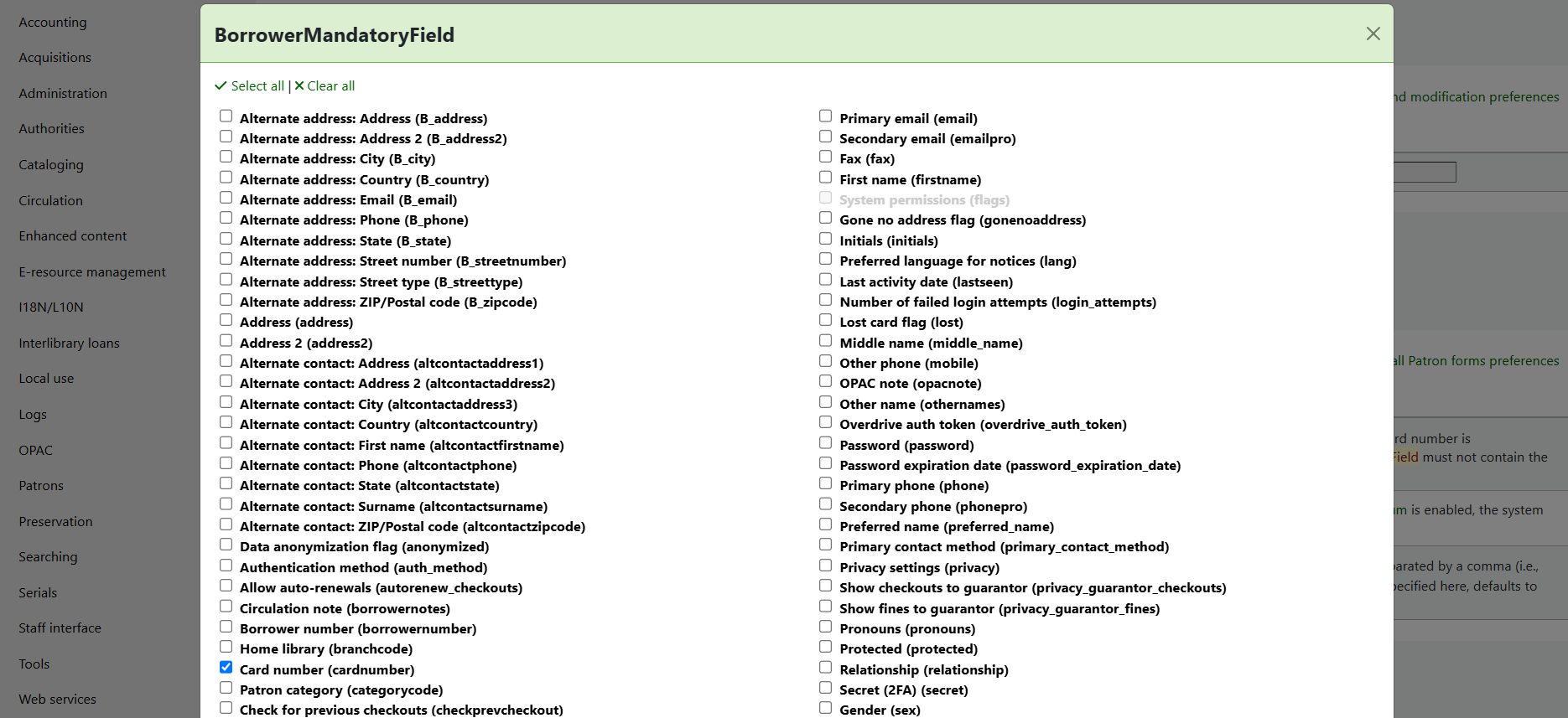 This system preference includes a box with a lock icon. Clicking in this box will create a popup which will show a list of all the borrower fields which can be marked as mandatory.