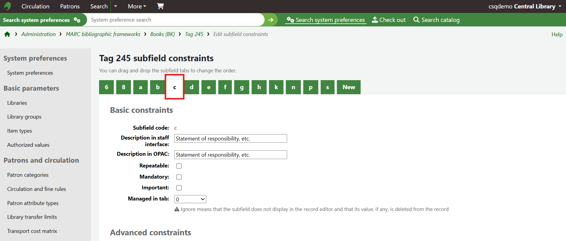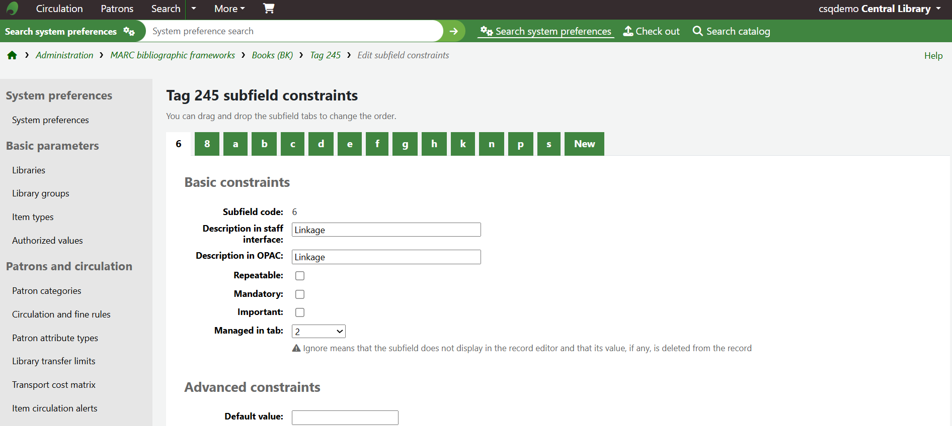 Under the Basic constraints section, there will be a line called Repeatable with a box to the right hand side. To mark a subfield as Repeatable, ensure there is a tick mark in the box. If there is no tick mark, click into the box so a tick appears. If there is a tick mark, make no changes to the box. If a tick is inserted into the box, click the Save changes button at the bottom of the screen.