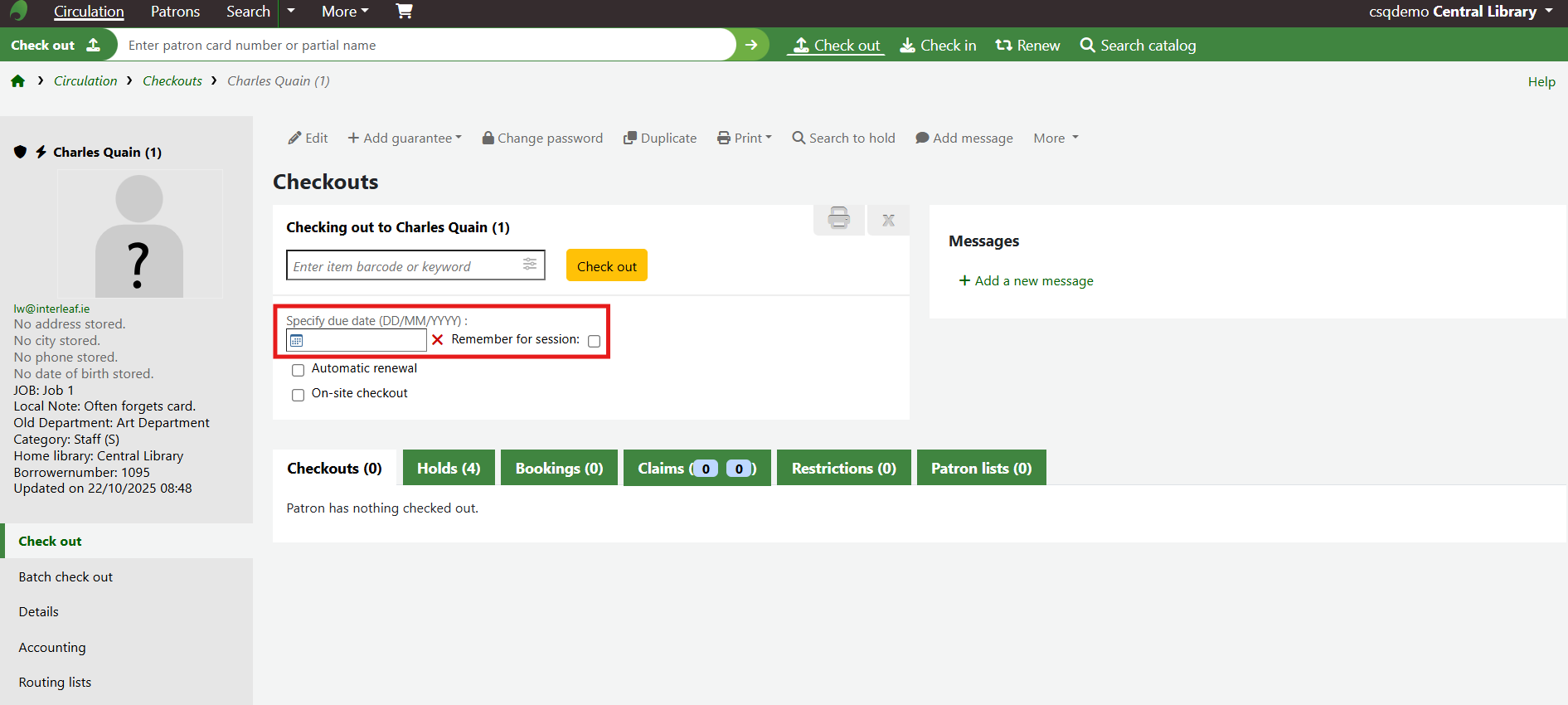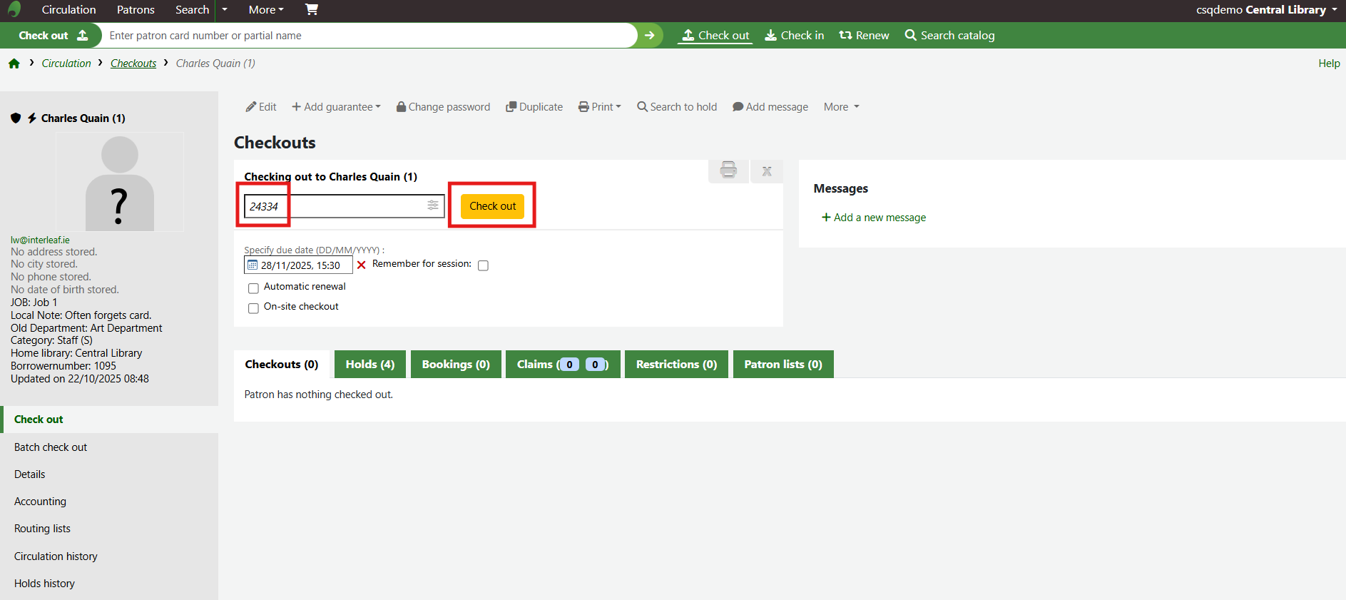 The selected date will populate the the Specify due date box. Scan or type the barcode of the item into the checkout box. If the barcode is scanned it should checkout automatically. If the barcode is typed into the box, the Check out button will need to be clicked.