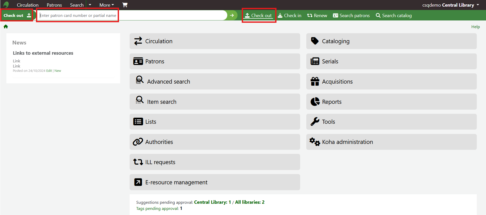 This can be completed in a number of ways, but when the aim of accessing the patron account is to complete a checkout the most efficient way of accessing the patron account is through the checkout option in the search box at the top of the screen. From the top of the homepage, confirm the Check out option to the right of the search box is underlined in white. If the checkout option is not underlined in white, click on Check out to select it and underline it in white. If the Check out option is selected, the search box will read Enter patron card number or partial name.