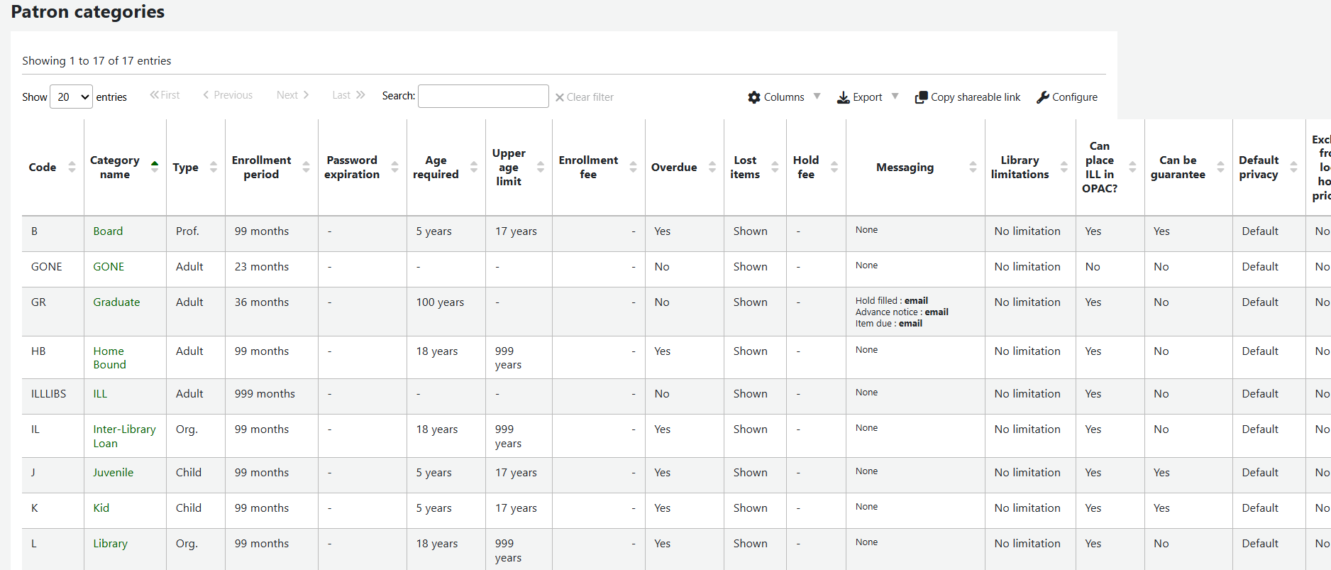Identify the patron category to add a password strength exception on and click the Edit button under the Actions column for the row the identified patron category is on.