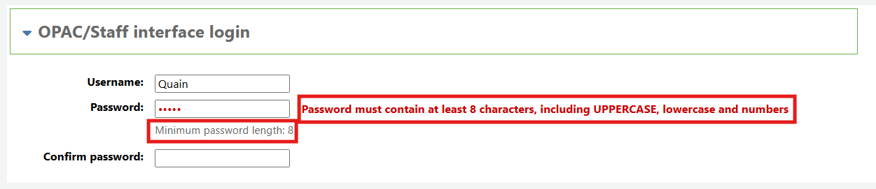 A password is required to be able to log into a patron account. This document will outline the system preferences that determine the required length and strength of a password on a patron account, as well as options for setting exceptions to these preferences at the patron category level.