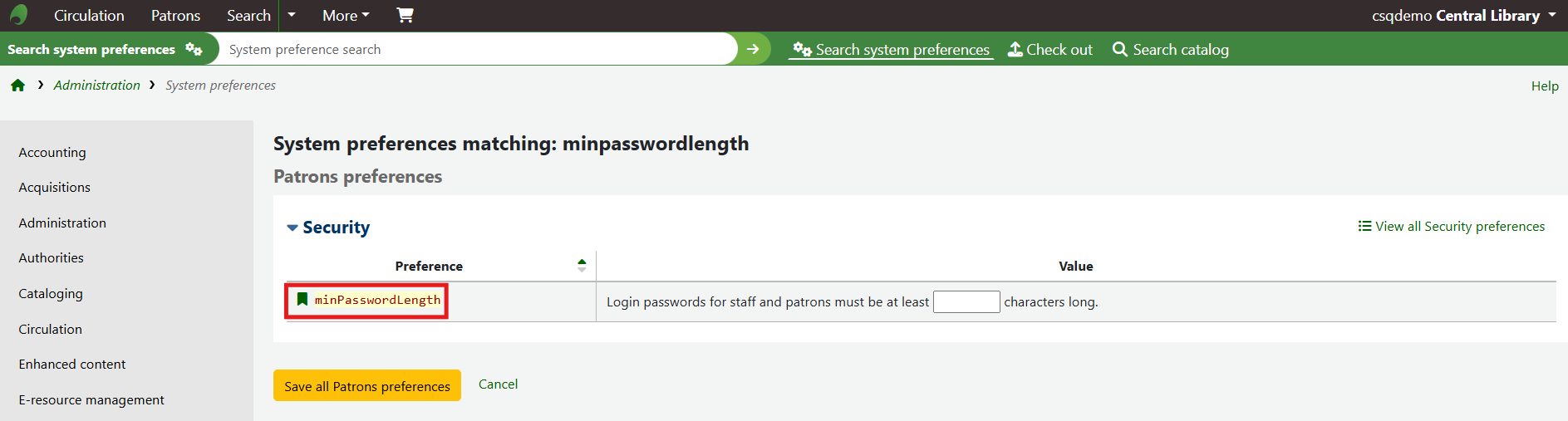 This system preference will have a box where the number of characters any password created on the system should have can be set. To change the minimum length a patron password must be, input the appropriate number in the box and click the Save all Patrons preferences.