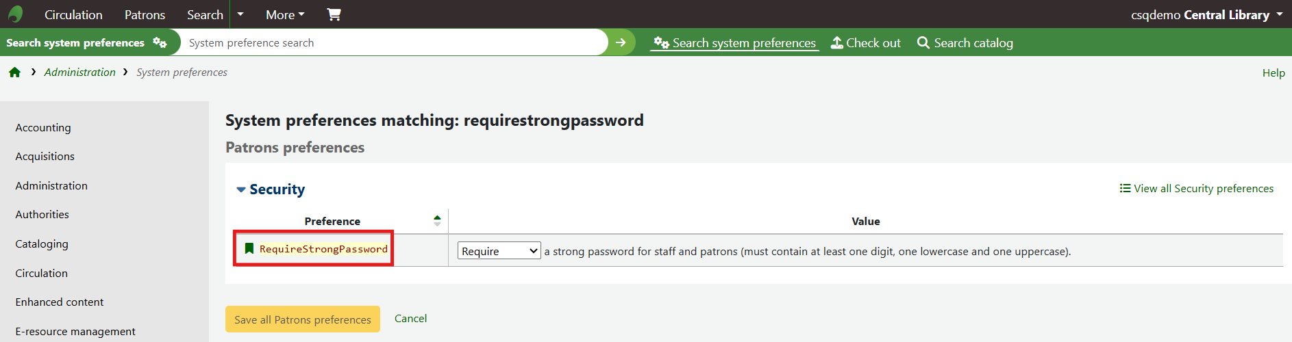 Enabling this system preference will mean that any passwords added to a patron account will need to include a minimum of one digit, one lowercase letter and one uppercase letter. To enable this system preference set it to Require a strong password for staff and patrons and click Save all Patrons preferences.