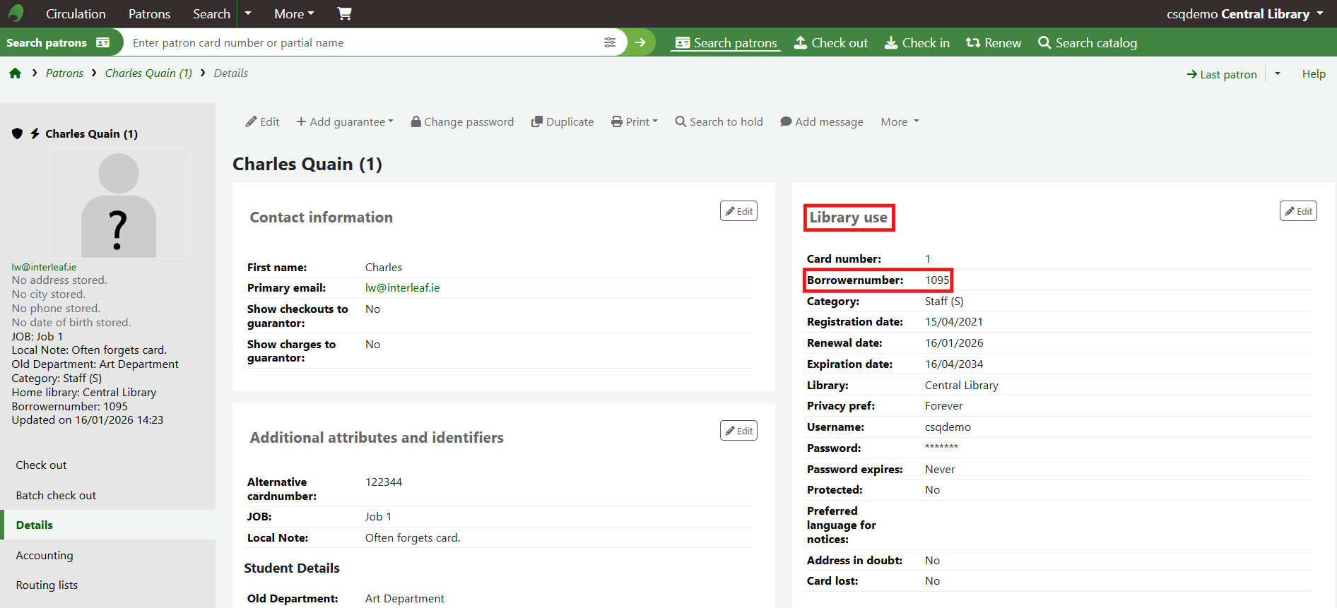 Borrowernumber are unique numbers that are automatically applied to new patron records by the Koha site as they are created. The borrowernumber must be unique and it cannot be edited from within the Koha application. The function of a borrowernumber is to act as an identification number for the patron record.