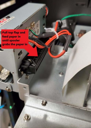Close the front mouth of receipt printer and feed paper into back feed entrance. Make sure to pull top flap for easier access before feeding |