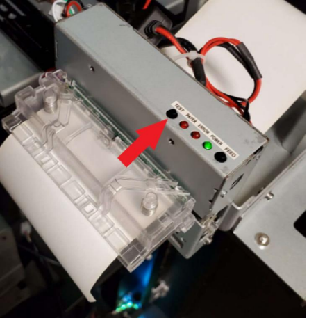 Paper will be extending out a little. Press the test button. Receipt printer will then print a test sheet and trim the paper |